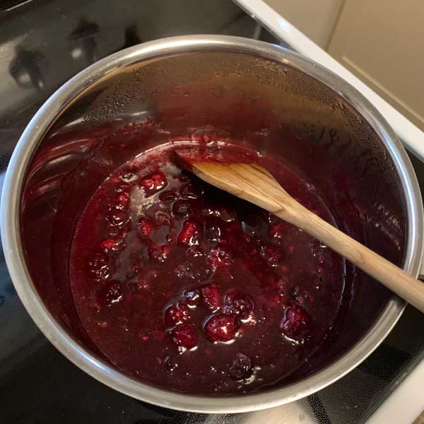 Once the dutch baby is in the oven, add blueberries, blackberries, sugar, lemon juice, and water to a small pot or saucepan