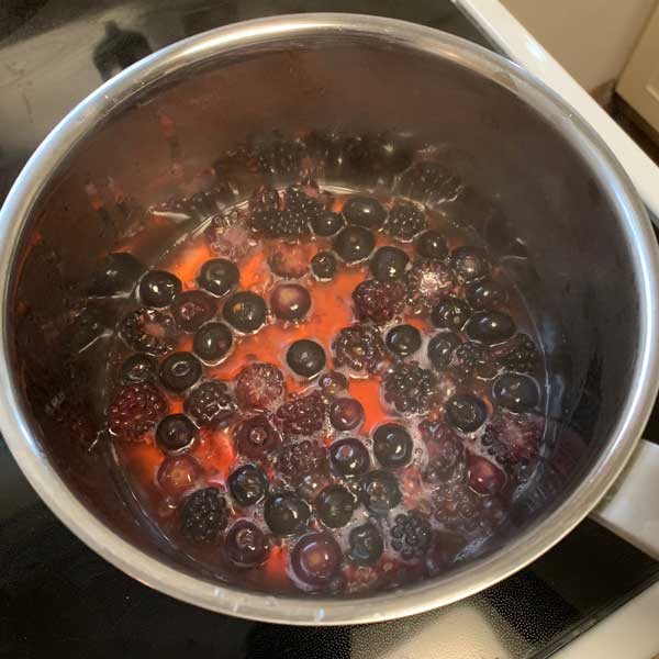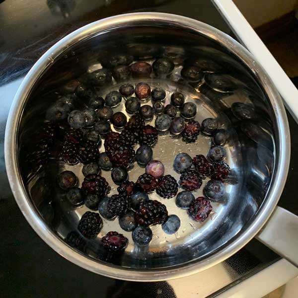 Once the dutch baby is in the oven, add blueberries, blackberries, sugar, lemon juice, and water to a small pot or saucepan